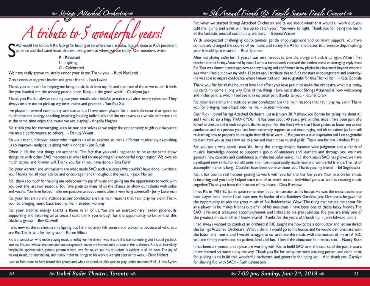The following tributes to the 5 wonderful years, 2014-2019 that Ric shaped Strings Attached Orchestra, attest to and highlight the long-lasting impact that Ric Giorgi has had on all of us. We are forever grateful.